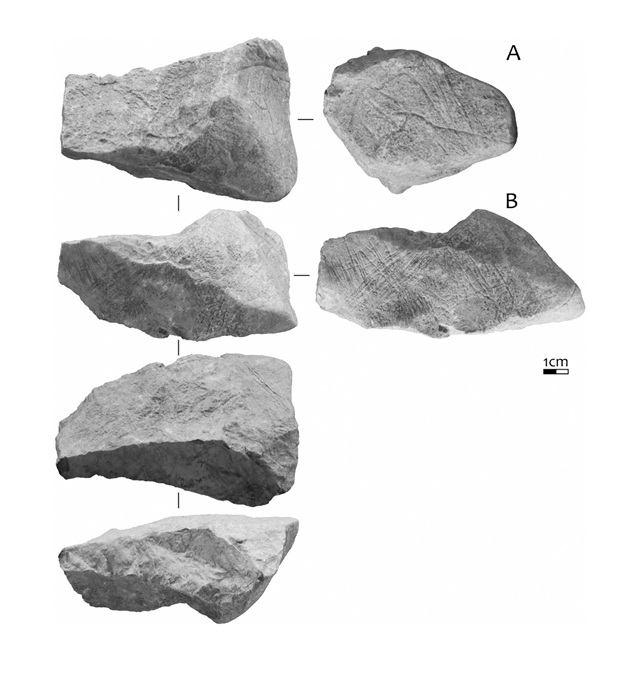 Obr. Rytý vápencový blok z jeskyně Švédův stůl v Moravském krasu. Na dvou sousedících plochách jsou zachovány pravěké rytiny koní – na ploše A je zřetelně vyobrazena hlava a krk koně, zatímco plocha B nese jednu či více koňských hlav, překrytých soustavou šikmých rytých linií.