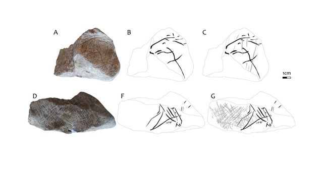 Obr. Rozbor rytin na vápencovém bloku z jeskyně Švédův stůl. (A–C) Rytiny na ploše A; (D–G) rytiny na ploše B. Černé linie vyznačují obrysy figurativních motivů (koní), světle šedé linie představují šikmé zářezy vyryté přes původní zobrazení