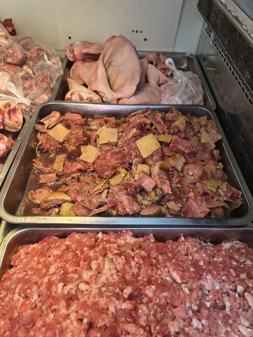 Ve vitríně prodejny bylo vystaveno také nebalené mleté maso a další masné výrobky neznámého původu (vlastní výroby). K výrobě mletého masa a dalších masných produktů je třeba registrace u Krajské veterinární správy, tu však prodejce neměl. Ve vitríně vystavoval také zabalenou drůbež neznámého původu s hlavou a běháky.