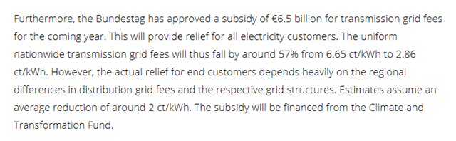 Minulý měsíc němečtí zákonodárci rozhodli dotovat z veřejných zdrojů poplatky za přenosovou soustavu (viz níže). Celkově na to Němci vyčlení pro příští rok 6,5 miliardy eur, tedy takřka 160 miliard korun. A to částka nezahrnuje jinou chystanou německou dotaci, na levnější energie pro průmysl.