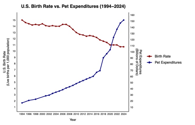 S povážlivě klesající porodností se i v Česku rozšiřuje fenomén bezdětných domácností, které si dítě nahrazují nejčastěji psem či kočkou. Podobná situace panuje i v ekonomicky nejvyspělejších zemích světa, včetně USA. Tým psychologů z amerických univerzit ve své letošní studii na dané téma (zde: https://helendevine.owlstown.net/publications/50469-pet-owners-often-see-dogs-as-soulmates-and-value-them-more-than-human-lives) dospívá k závěru, že „obzvláště bezdětní pejskaři mají sklon vnímat svého psa jako spřízněnou duši, přičemž data odhalují, že klesající porodnost je silně spjata s růstem výdajů za mazlíčky“ (viz graf níže: červená křivka zachycuje klesající porodnost, modrá pak stoupající výdaje za mazlíčky, jejichž vzestup ke markantní o po očištění o inflaci a růst ekonomiky). Jeden ze čtyř Američanů, kteří vlastní psa, podle studie dá v rámci charity raději 50 dolarů potřebnému štěněti než potřebnému dítěti. Takřka polovina amerických pejskařů pak raději v rámci charity nakrmí neznámé štěně než cizího člověka.