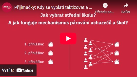 Think-tank IDEA při CERGE-EI zveřejňuje osvětové video, které vysvětluje fungování algoritmu, kterým Cermat páruje uchazeče se školami. Jde o tzv. mechanismus odloženého přijetí (angl. deferred acceptance mechanism) zavedený v roce 2024 při digitalizaci přijímacího řízení. Video je určeno především uchazečům, jejich rodičům i pracovníkům škol a představuje také návod na to, kdy se při hlášení na školy vyplatí taktizovat, a kdy ne.
