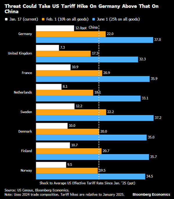 Pokud Trump naplní svoji hrozbu a 1. února desetiprocentní nové clo vskutku zavede, bude to znamenat, že během svého druhého funkčního období v Bílém domě navýšil clo třeba Německu či Francii výrazněji než Číně. Například desetiprocentní nové clo na německý vývoz do USA by znamenalo, že američtí importéři německého zboží odvedou do veřejné kasy USA v průměru sumu odpovídající celní sazbě hned o 22 procentních bodů vyšší, než jaké čelili v lednu 2025, těsně před Trumpovým nástupem do Bílého domu (viz graf Bloombergu níže).