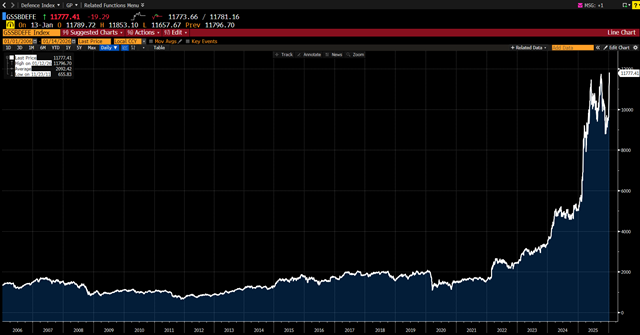 Takovému scénáři nahrává vývoj souhrnného indexu akcií firem evropského zbrojařského průmyslu, který přes dvacet let sestavuje americká banka Goldman Sachs. Tento ukazatel v tomto týdnu, konkrétně v pondělí, uzavřel na svém historickém maximu, bezmála 11 800 bodů (viz graf Bloombergu bníže).