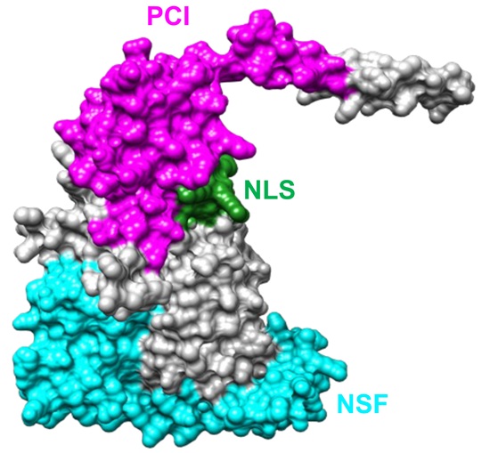 Zjednodušený 3D model zkoumaného proteinu eIF3E. Zvýrazněny jsou tři důležité funkční části. Oblast označená NSF pomáhá navést protein na správné místo v buňce. NLS slouží jako signál pro vzstup proteinu do buněčného jádra. PCI pomáhá proteinu spojit se s jinými bílkovinami a vytvořit větší funkční komplexy. Zdroj: autoři článku v The Plant Cell, licence CC BY 4.0