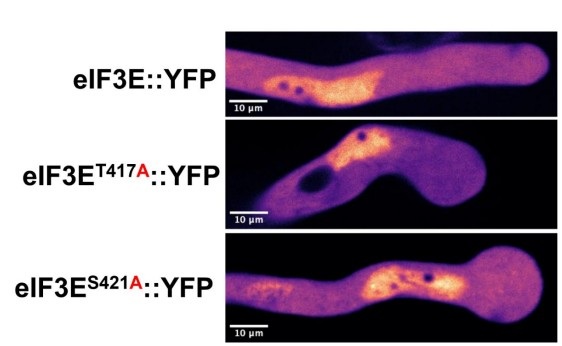 Změny ve struktuře proteinu eIF3E ovlivňují růst pylových láček. Na horním snímku je normálně rostoucí pylová láčka s plně funkční bílkovinou. Proteiny se skládají z menších „stavebních kamenů“ – aminokyselin. Když vědci nahradili konkrétní aminokyseliny v eIF3E jinými, láčky se přestaly prodlužovat a jejich konce se zvětšily (uprostřed a dole). To ukazuje, že tyto aminokyseliny jsou důležité pro správnou funkci eIF3E. Zdroj: autoři článku v The Plant Cell, licence CC BY 4.0
