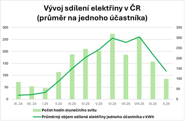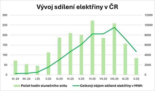 Vývoj objemu sdílené elektřiny v České republice kopíruje množství slunečního svitu v jednotlivých měsících. Vyplývá to z porovnání statistik Elektroenergetického datového centra (EDC) za první rok sdílení elektřiny a údajů Českého hydrometeorologického ústavu (ČHMÚ). V říjnu kleslo množství sdílené elektřiny na úroveň jarních hodnot.