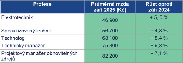 „Energetické firmy systematicky poptávají pracovníky na specializované technické a odborné pozice – od energetiků a technologů přes techniky řízení provozu až po projektové manažery nebo odborníky na obnovitelné zdroje,“ říká Michal Španěl, manažer a datový analytik JenPráce.cz a dodává: „Mezi často zastoupené profese patří například elektrotechnici, kteří v průměru dosahují mzdy kolem 46 900 Kč, což znamená meziroční nárůst zhruba o 5,5 %. Na tuto úroveň navazují specializovaní technici, typicky se zaměřením na údržbu energetických zařízení, automatizaci či měření – jejich průměrné mzdy se pohybují kolem 56 700 Kč a meziročně vzrostly přibližně o 4,8 %.“