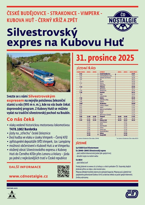 Nemáte ještě plány na poslední den letošního roku? Pojeďte si užít Silvestra na střechu české železnice – na Kubovu Huť. Ve středu 31. prosince se můžete svézt s dobrou náladou na tuto nejvýše položenou železniční stanici u nás Silvestrovskými expresy. České dráhy poslední den letošního roku vypraví tři páry speciálních vlaků mezi Vimperkem a Kubovou Hutí. Z Kubovy Hutě se pak můžete vydat i na tradiční silvestrovský pochod na Boubín.