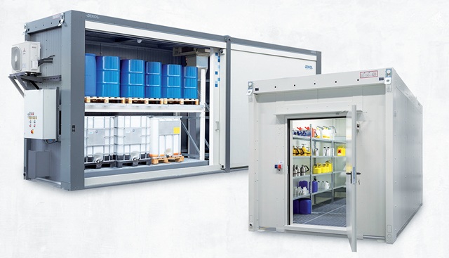 Pro uložení většího množství sudů nebo jiných obalů nabízí DENIOS zhotovení individuálního návrhu a projektu kompletních zastřešených kontejnerových skladů. Tyto sklady nahrazují běžné skladovací haly a jsou vždy navrženy přesně dle konkrétních požadavků. V případě nutnosti skladování látek a materiálů citlivých na teplotu jsou k dispozici vytápěné, chlazené nebo klimatizované skladovací kontejnery. Ty jsou vyrobeny z vysoce kvalitních izolačních materiálů, které zaručují udržení požadované skladovací teploty uvnitř kontejneru. Pro uložení hořlavých látek a zároveň pro splnění všech bezpečnostních předpisů při jejich skladování nabízí DENIOS speciální požárně odolný kontejner s odolností REI 90.