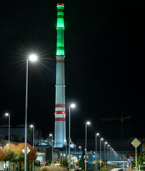 Nápadité nasvícení komína v sobě neslo i další symboliku, protože současně připomíná 30 let existence dceřiné firmy ŠKO-ENERGO. Ta zajišťuje energie pro automobilku i více než 14 tisíc domácností v Mladé Boleslavi a jejími podílníky jsou vedle automobilky Škoda Auto i společnosti ČEZ, E.ON a VW Kraftwerk. Společnost významně přispívá k dosažení uhlíkové neutrality české automobilky. Zásadní je v tomto směru probíhající modernizace teplárny v Mladé Boleslavi na 100% využití biomasy, která by měla být dokončena do konce roku 2027, náhrada zemního plynu biometanem v závodě ve Vrchlabí a zapojení obnovitelných zdrojů energie včetně větrného parku v Melči, který ročně vyrobí přes 26 GWh energie a funguje od začátku roku 2024. Součástí projektu na cestě k uhlíkové neutralitě je i instalace fotovoltaických elektráren. Provozuje a spravuje celkem 8 739 fotovoltaických panelů s celkovým ročním instalovaným výkonem 3 380 KWp. (29.10.2025)