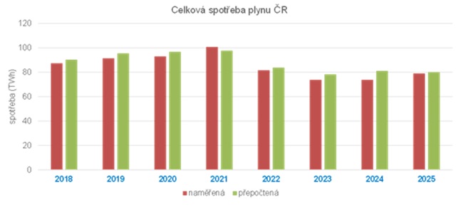 Spotřeba zemního plynu se v naměřených hodnotách v České republice v roce 2025 oproti předchozímu roku zvýšila o 6,9 % na 79 TWh. V teplotně přepočtených hodnotách ale podle poradenské společnosti EGU poklesla o přibližně 1,2 %. Tento výsledek je daný velmi výrazným teplotním rozdílem mezi posledními dvěma topnými sezonami.
