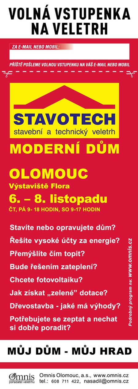 Stavební a technický veletrh STAVOTECH - Moderní dům Olomouc se za dobu svého trvání vypracoval v největší podzimní stavební veletrh na Moravě! 66. pokračování veletrhu se koná od čtvrtku 6. do soboty 8. listopadu 2025 v pavilonu A a přilehlých venkovních plochách olomouckého Výstaviště Flora. Bohatá nabídka firem doplněná o řadu doprovodných výstav, seminářů a prezentací dělají z akce atraktivní prostor pro načerpání nových informací, myšlenek, nápadů i inspirace.