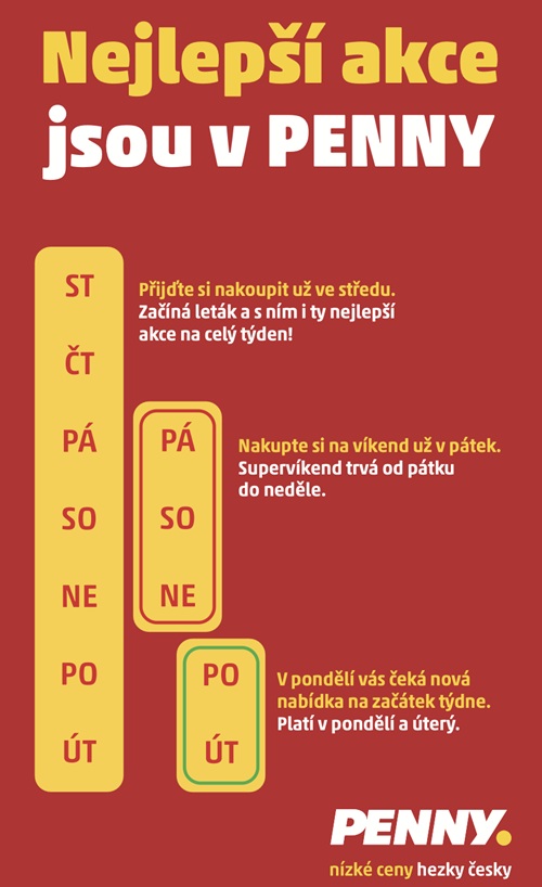Akční nabídky patří dlouhodobě mezi hlavní lákadla zákazníků do prodejen PENNY. Díky vysokému zájmu o letákové akce se čtvrtek v uplynulých letech stal nejsilnějším dnem z hlediska nákupního chování zákazníků. Společnost se proto rozhodla na tento úspěšný model navázat a nabídnout nové akce již o den dříve.