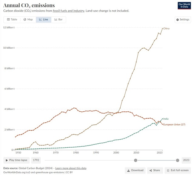 EU totiž od roku 2005 do roku 2023 snížila své emise přesně o tolik, o kolik je navýšily pouze Čína s Indií od poloviny roku 2020 do roku 2023 (viz graf níže). Evropská unie navíc své emise snížila z podstatné části proto, že se deindustrializovala a předala své technologické know-how, budované po staletí, zejména do Číny.