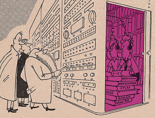 Existence samočinných počítačů způsobila, že člověk začal porovnávat činnost těchto automatů s činností živých bytostí. Mluvilo se o „obřích mozcích“, o „myslících strojích“ a většinou byla obdivována jejich pracovní rychlost proti skutečnosti, že se podařilo úplně zautomatizovat určité funkce velmi složité duševní práce člověka. Srovnávání samočinných počítačů s lidským mozkem vedlo k založení kybernetiky jako nového vědeckého směru. Toto srovnání má přirozeně svou omezenou platnost: stroje samy jsou dílem lidí a žádný kybernetický stroj nemůže pracovat bez programu, který do něho člověk vložil.
