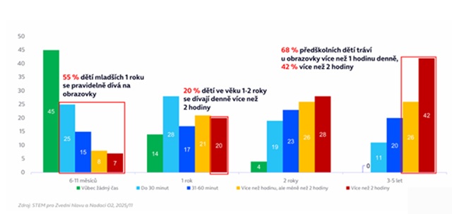Nový průzkum od agentury STEM, který si Nadace O2 spolu se Zvedni hlavu nechaly vytvořit, přináší celou řadu závažných zjištění a přináší vhled do toho, kolik času tráví malé děti u obrazovek, i to, jaký obsah je rodiče nechávají sledovat. Průzkumu se zúčastnilo více než 1000 rodičů dětí z celé republiky ve věku 0-5 let.