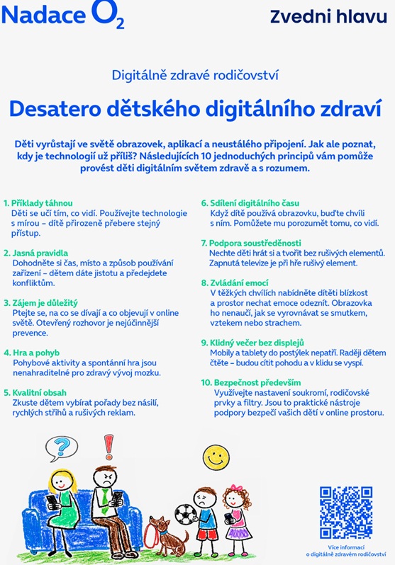 Děti v Česku se pravidelně setkávají s obrazovkami už od kojeneckého věku. Nový průzkum neziskové organizace Zvedni hlavu s podporou Nadace O2 ukazuje, že digitální technologie jsou běžnou součástí života dětí už od narození. Často však bez jasných pravidel, s nevhodným obsahem a bez přítomnosti rodiče. Proto se organizace Zvedni hlavu a Nadace O2 spojily, aby přinesly praktická řešení pro rodiny - Desatero zdravého rodičovství, podcasty s odborníky, vzdělávací články, webinář pro rodiče zdarma a mnoho dalších.