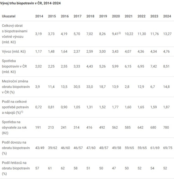 Český trh s biopotravinami pokračoval v roce 2024 v růstu. Celkový obrat českých podniků s biopotravinami včetně vývozu dosáhl přibližně 13,27 miliardy korun (o rok dříve to bylo 11,76 miliardy korun). Spotřeba biopotravin na domácím trhu činila 8,51 miliardy korun, zatímco hodnota vývozu vzrostla na 4,76 miliardy korun.