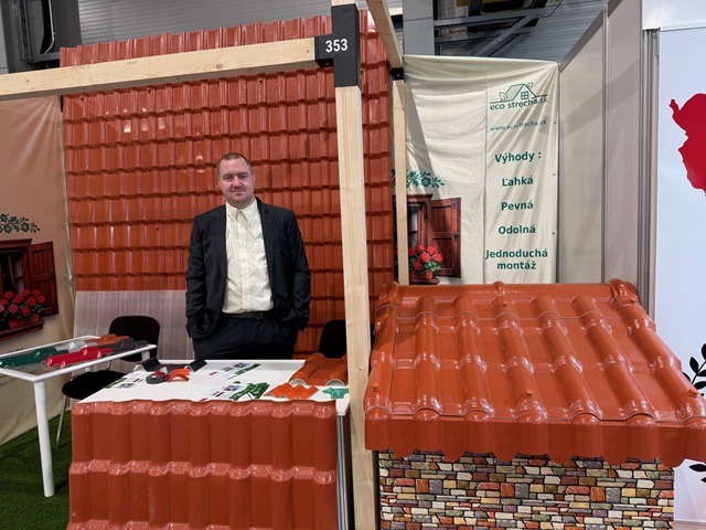 Přímo střechy zastupovala slovenská firma Richard Hattas – Group s panely ve tvaru několika řad klasických červených tašek z plastu PVC, které na rozdíl od těch klasických pálených cihelných jsou nerozbitné, a především usnadňují jejich pokládku a tolik nezatěžují krovy. A mohou být i v různých barvách.