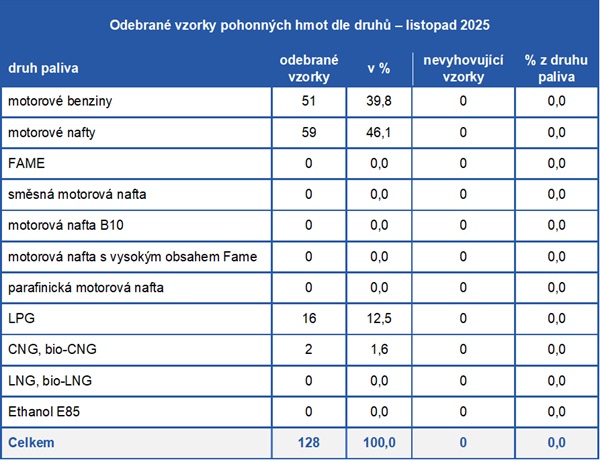 Oproti říjnu bylo v listopadu zaznamenáno zlepšení u odebraných a kontrolovaných vzorků motorových benzinů z 1,4 % na 0,0 %. Vzorky FAME, směsné motorové nafty, motorové nafty B10, motorové nafty s vysokým obsahem FAME, parafinické motorové nafty, bio-CNG, LNG, bio-LNG a ethanolu E85 nebyly vzhledem k vývoji na trhu s pohonnými hmotami v listopadu odebrány (29.12.2025)