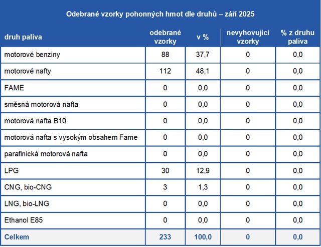 Česká obchodní inspekce monitorovala kvalitu pohonných hmot v měsíci září 2025. Na čerpacích stanicích v ČR odebrala celkem 233 vzorků, z toho 88 vzorků motorových benzinů, 112 vzorků motorových naft, 30 vzorků LPG a 3 vzorky CNG. Všechny vzorky vyhověly stanoveným jakostním požadavkům.