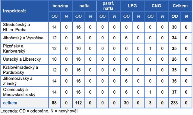 Výsledky kontroly jakosti pohonných hmot podle inspektorátů:
