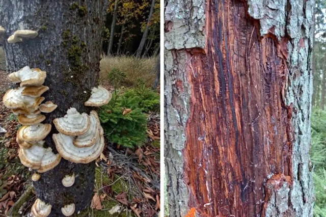 Foto: smrk ztepilý napadený václavkou a troudnatcem, autor Jan Řezáč