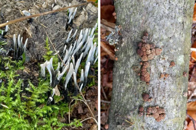 Foto: vlevo – dřevnatka parohatá (Xylaria hypoxylon) na mrtvém dřevu, Nové Veselí; vpravo – dřevomor červený (Hypoxylon fragiforme) na odlomené větví buku lesního, Račín, autor František Lorenc