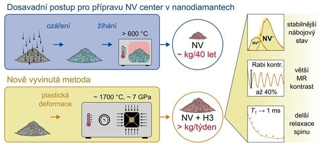 Standardní postup přípravy NV (nitrogen vacancy) kvantových center v nanodiamantech zahrnuje nákladné ozáření v částicových urychlovačích a žíhaní. Je pracný i časově náročný. Nová metoda, využívající plastickou deformaci při velmi vysoké teplotě a tlaku, vytváří jak červeně svítící NV centra, tak zeleně svítící H3 centra. Navíc opravuje diamantovou mřížku a tyto částice pak mají stabilnější nábojový stav, vetší magnetorezonační (MR) kontrast a lepší spinové vlastnosti NV center, což umožňuje citlivější a přesnější měření. (29.10.2025)