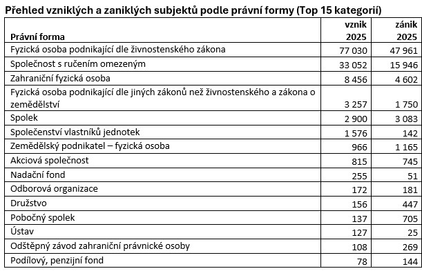 Podle dat společnosti Saleskit vloni v Česku vzniklo 129 280 nových ekonomických subjektů včetně OSVČ, s. r. o., akciových společností a dalších – tedy podobně jako v roce 2024. Zásadnější meziroční rozdíl a pozitivní trend se ovšem ukazuje ve statistice zaniklých subjektů. „Zatímco předloni svou činnost ukončilo téměř 100 000 firem a podnikatelů, v uplynulém roce to za srovnatelné období bylo méně než 80 tisíc. Podnikatelské prostředí v Česku si tak po náročných letech české ekonomiky, spojených s vysokou inflací, cenami energií i složitou geopolitickou situací, užívá určitou stabilitu,“ dodává Tomáš Berger, CEO společnosti Saleskit.