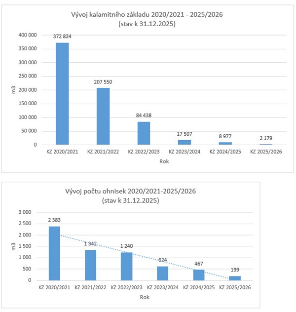 Obávaný brouk je i nadále na ústupu z lesů. Potvrzuje to pokles kalamitního základu a počtu i velikosti kůrovcových ohnisek. V aktuálním období 2025/2026 se kalamitní základ snížil o téměř 75 % (z 9 tis. m3 na 2,5 tis.m3) ve srovnání s minulým obdobím 2024/2025. Za celý rok 2025 bylo zpracováno pouze 7 100 m3 kůrovcového dříví, což je méně než polovina objemu zpracovaného v roce 2024 (18 300 m3).