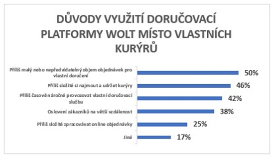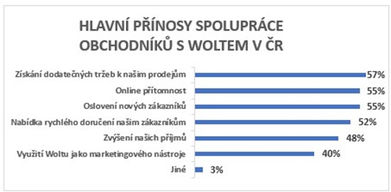 Polovina dotázaných českých obchodníků uvedla, že hlavním důvodem, proč využívají služeb Woltu, je nepředvídatelný objem zakázek. Wolt tak restauračním podnikům a obchodníkům pomáhá právě v rozvozu objednávek, protože provoz vlastní doručovací služby je pro řadu z nich neefektivní. Dalších 46 % označilo jako překážku složitost najímání a udržení kurýrů, 42 % pak vysokou časovou náročnost provozu vlastní doručovací služby. Wolt tak pro obchodní a restaurační partnery představuje především flexibilní a také udržitelné řešení. Přínosem pro více než třetinu obchodníků je pak i možnost oslovit zákazníky na větší vzdálenost.