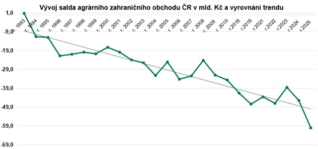 Rok 2025 se mj. vyznačuje tím, že poprvé v historii agrární dovozy do ČR překonaly hranici 400 mld. Kč a záporné agrární saldo poprvé překonalo -60 mld. Kč. Což je absolutně nejhorší výsledek v historii samostatného Česka a meziročně se prohloubilo o téměř 13 mld. Kč.